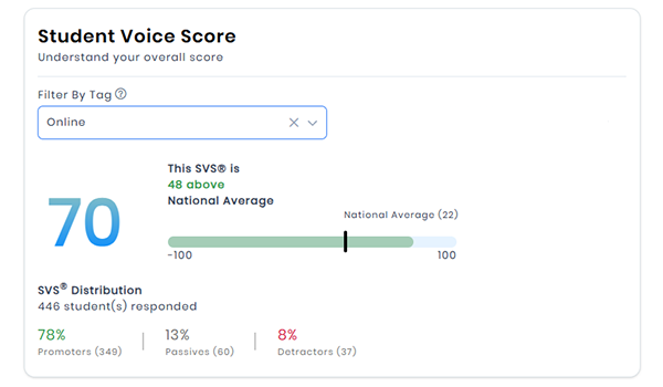 The SVS is calculated by subtracting the percentage of students who are detractors (rated a 0-6) from the percentage of promoters (rated a 9 or 10). The SVS ranges from -100 to 100, and scores above 0 indicate more overall promoters than detractors.